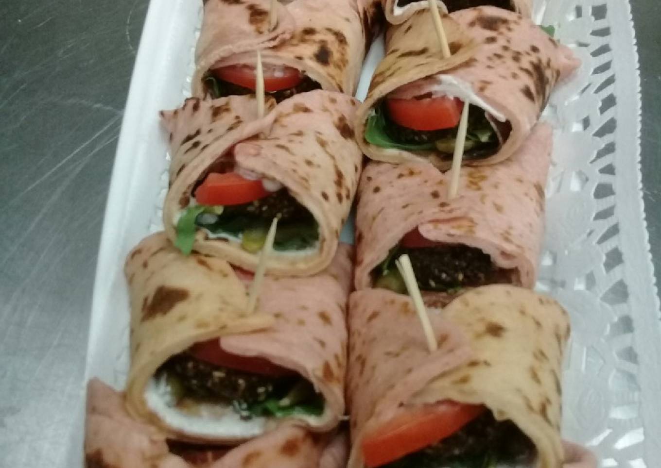 - Take 1 bread,cut it half then take half put sauce then put the fillings (Put sauce,then jarjeer,cucumber pickled,falafeland tomato) and then fold and put toothpick so that it will not open.