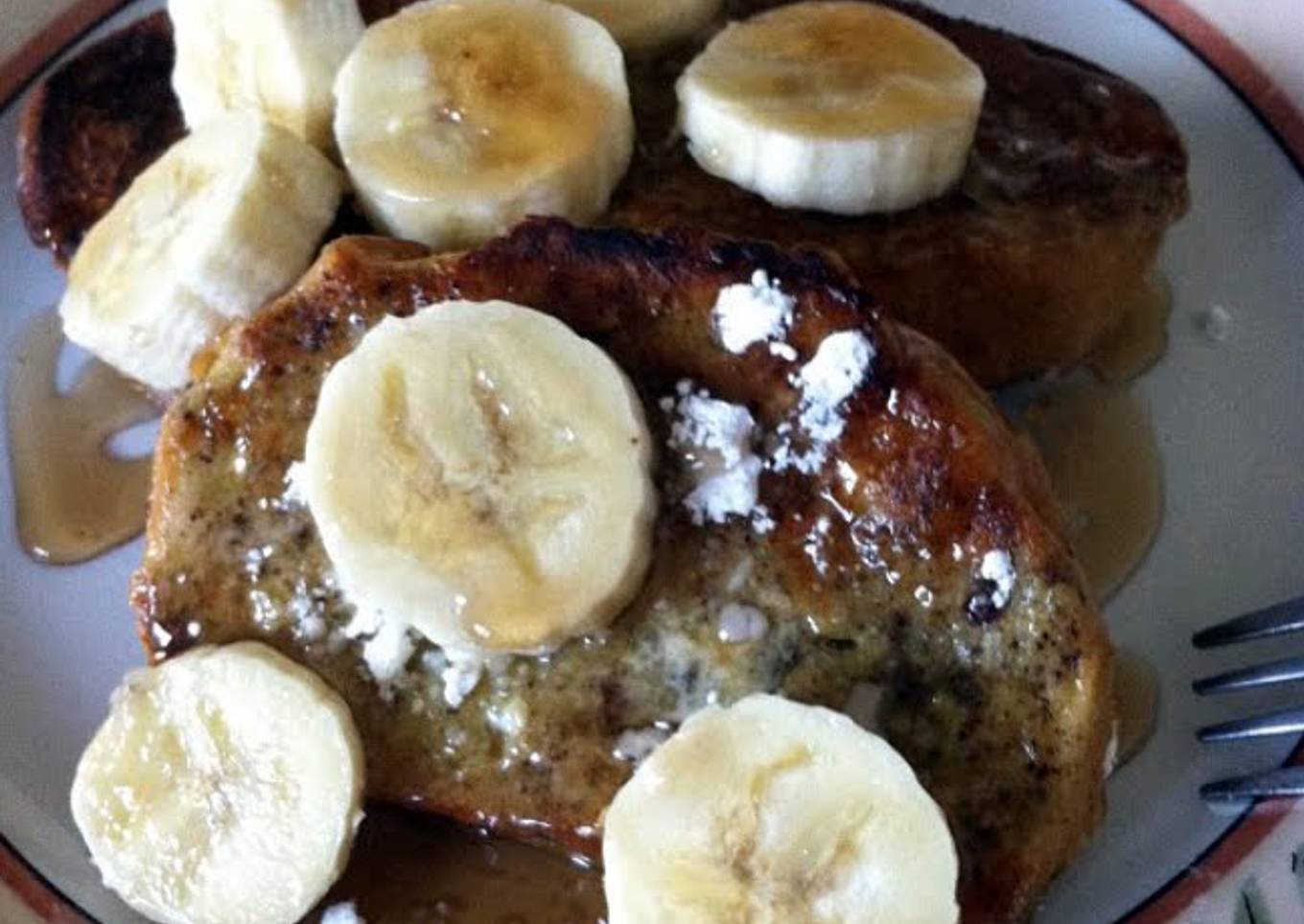 - once each side is done place slices on a plate add powder sugar. slice a banana & place them on top of the bread & add syrup